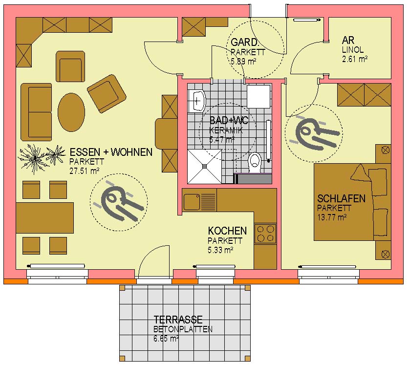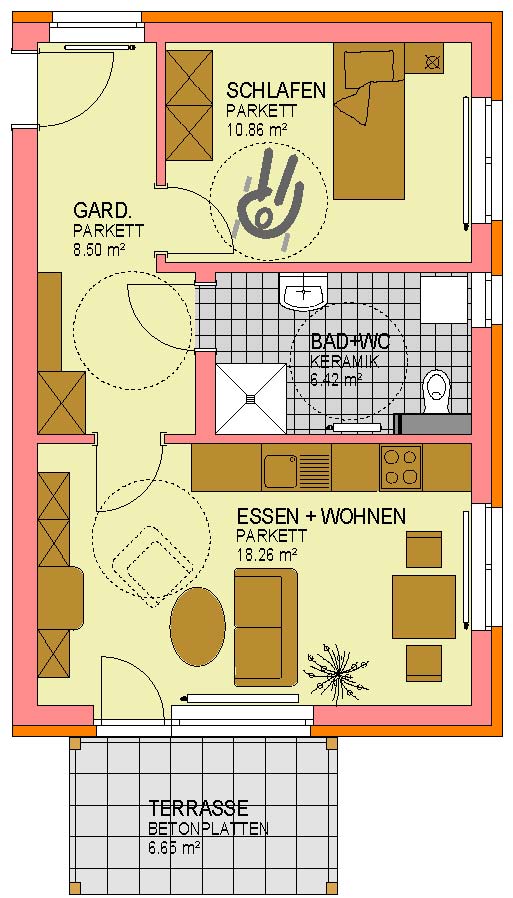 Bad/WC, Garderobe, Kellerabteil, Küche, Schlafzimmer, Terrasse, Wohn/EsszimmerStockwerk
