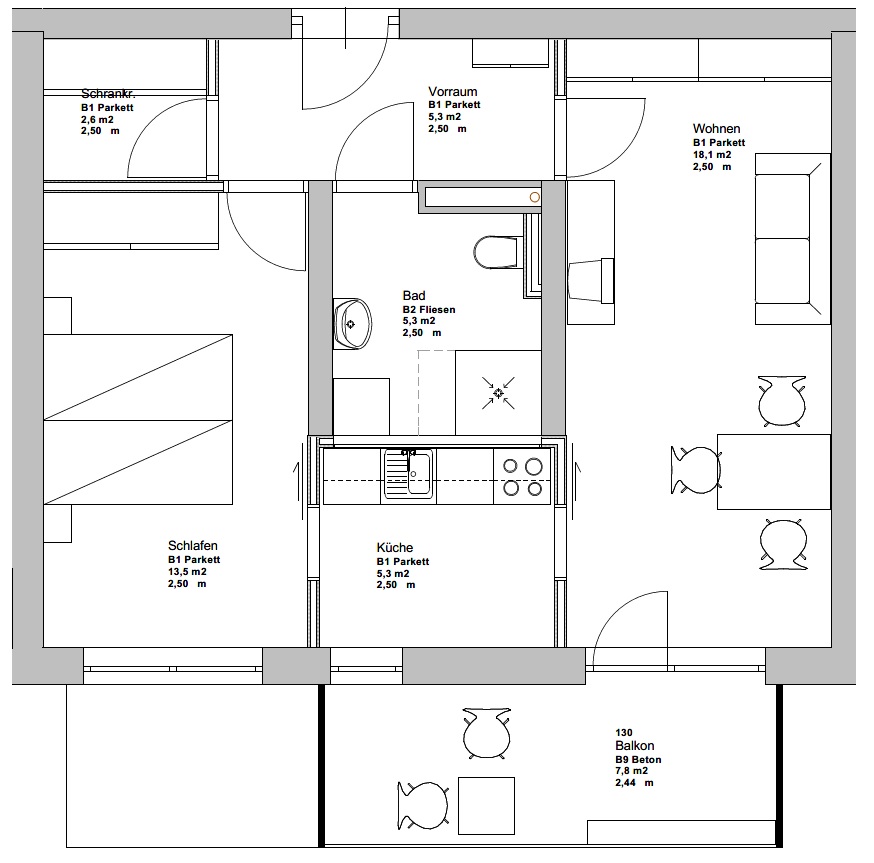 Abstellplatz, Bad/WC, Balkon, Kellerabteil, Küche, Schlafzimmer, Schrankraum, Vorraum, WohnzimmerStockwerk