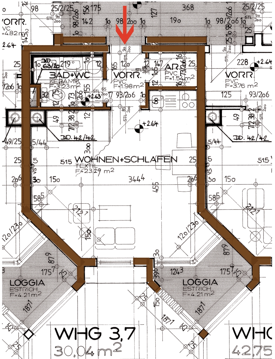 Abstellraum, Bad/WC, Kellerabteil, Kochnische, Loggia, Vorraum, Wohn/SchlafraumStockwerk