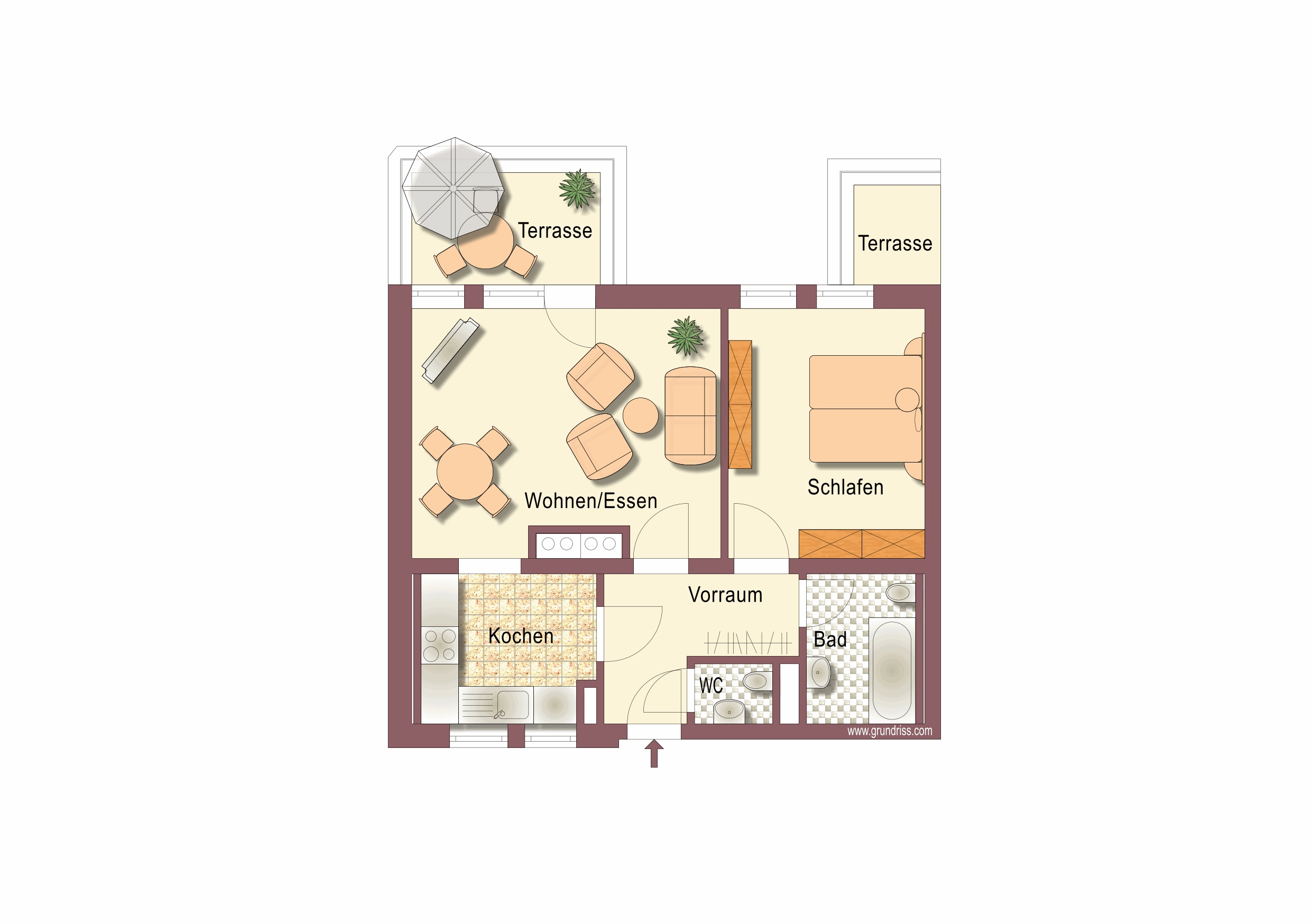 Bad, Kellerabteil, Küche, Schlafzimmer, Terrasse, Tiefgaragenabstellplatz, Vorraum, WC, WohnzimmerStockwerk