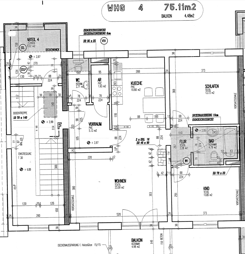 Abstellplatz, Abstellraum, Bad, Balkon, Flur, Kellerabteil, Kinderzimmer, Küche, Schlafzimmer, Vorraum, WC, WohnzimmerStockwerk