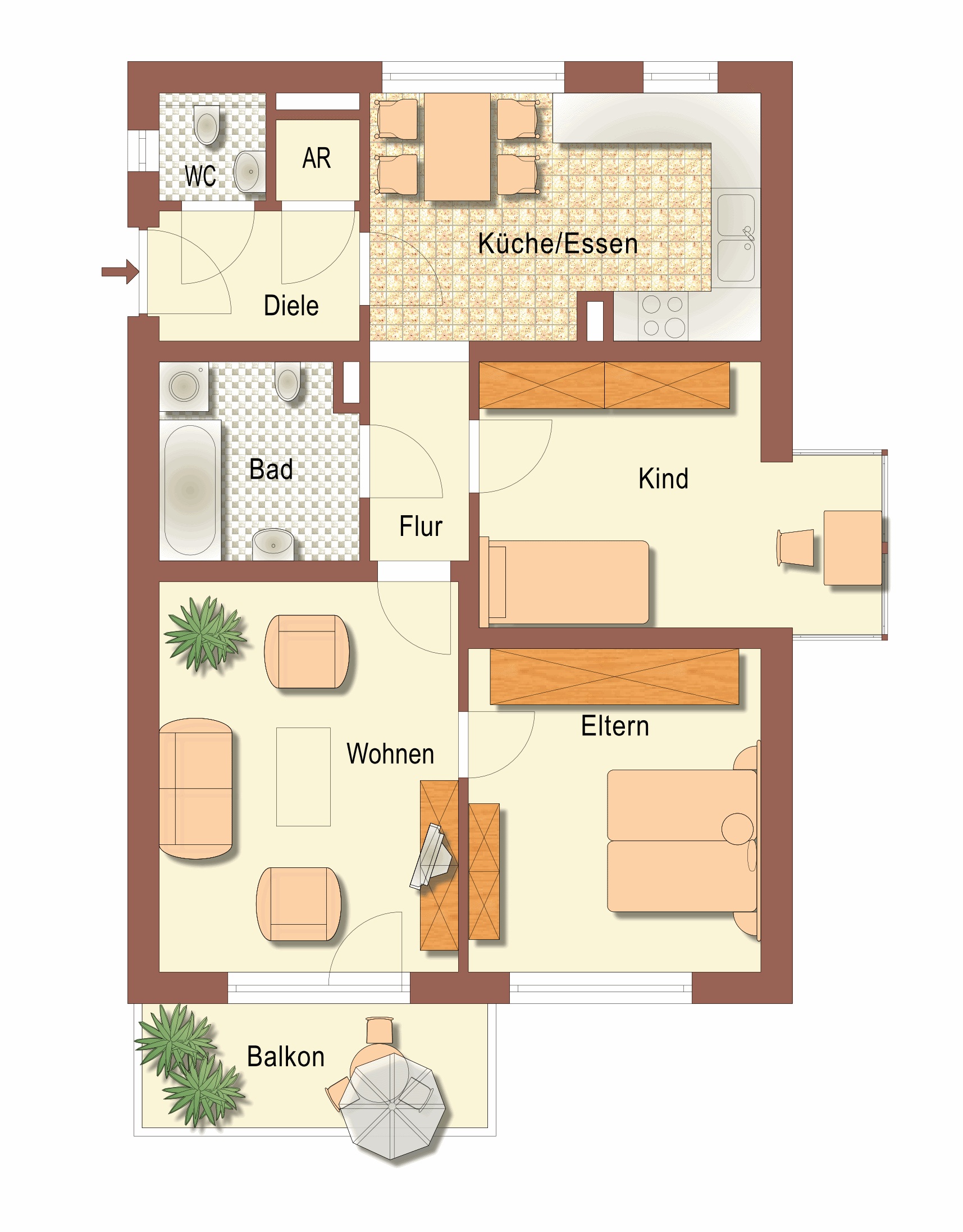 Abstellraum, Bad, Balkon, Carport, Diele, Esszimmer, Gang, Kellerabteil, Kinderzimmer, Küche, Schlafzimmer, WC, WohnzimmerStockwerk
