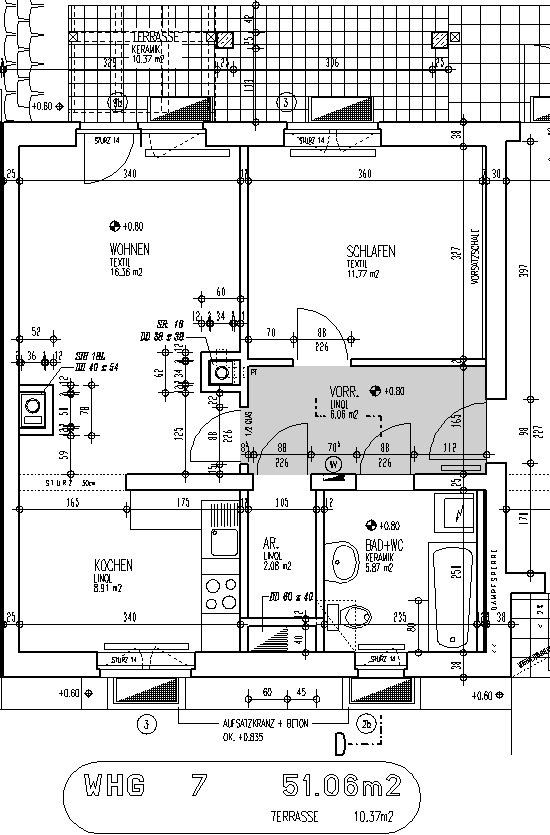 Abstellplatz, Abstellraum, Bad/WC, Kellerabteil, Küche, Schlafzimmer, Terrasse, Vorraum, WohnzimmerStockwerk