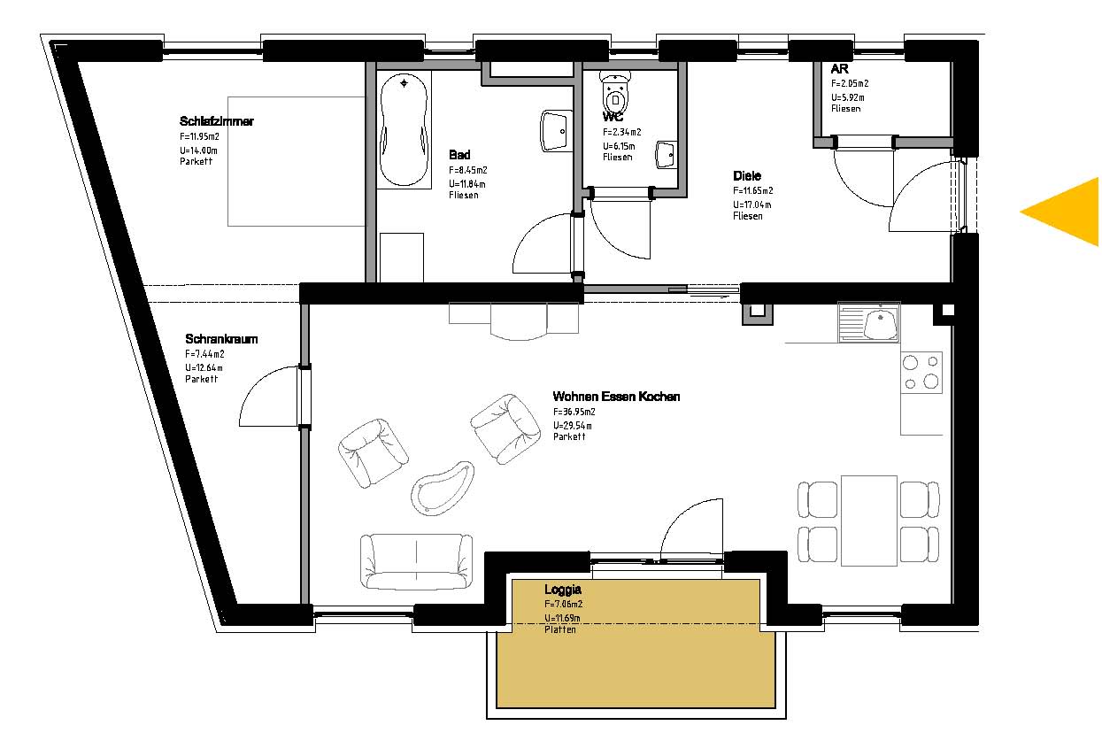 Abstellraum, Bad, Balkon, Diele, Kellerabteil, Loggia, Schlafzimmer, Schrankraum, Tiefgaragenabstellplatz, WC, WohnkücheStockwerk