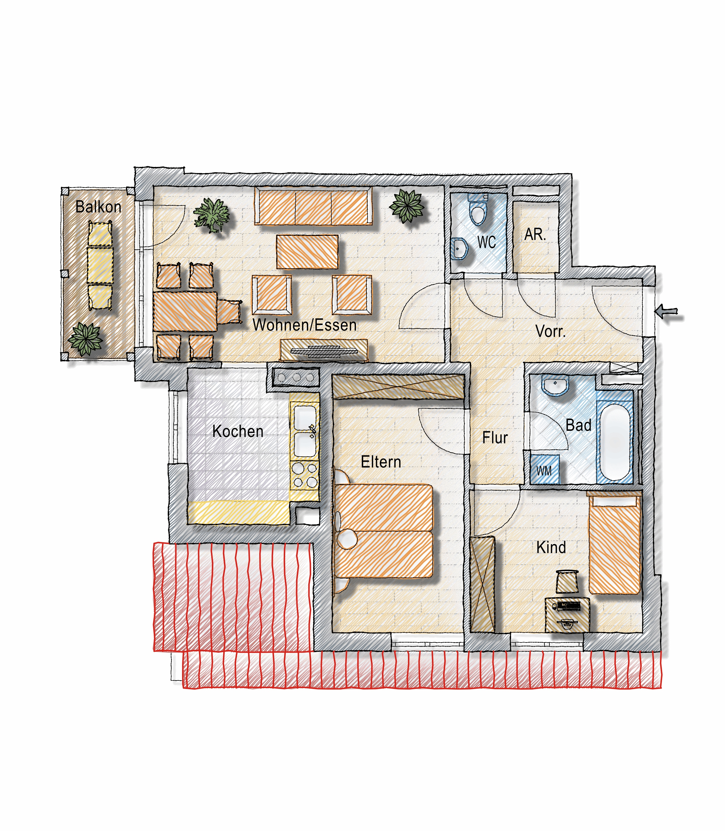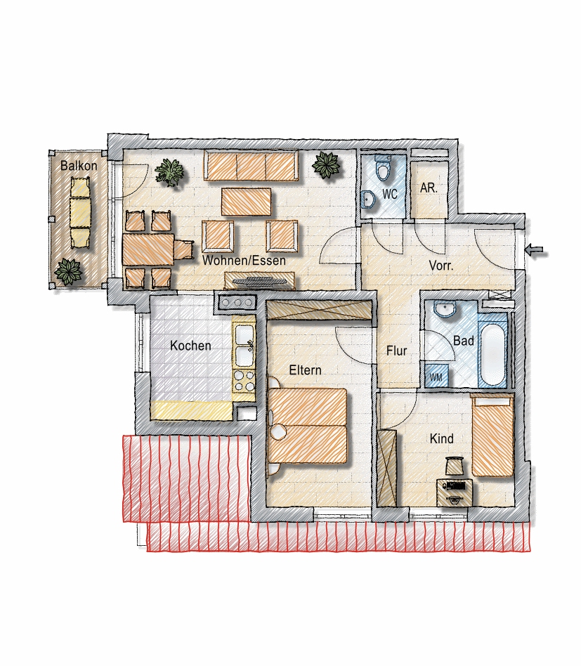 Abstellraum, Bad, Balkon, Carport, Flur, Kellerabteil, Kinderzimmer, Küche, Schlafzimmer, Vorraum, WC, Wohn/EsszimmerStockwerk