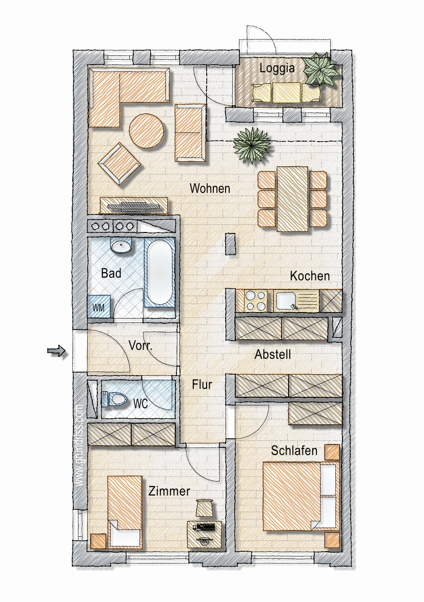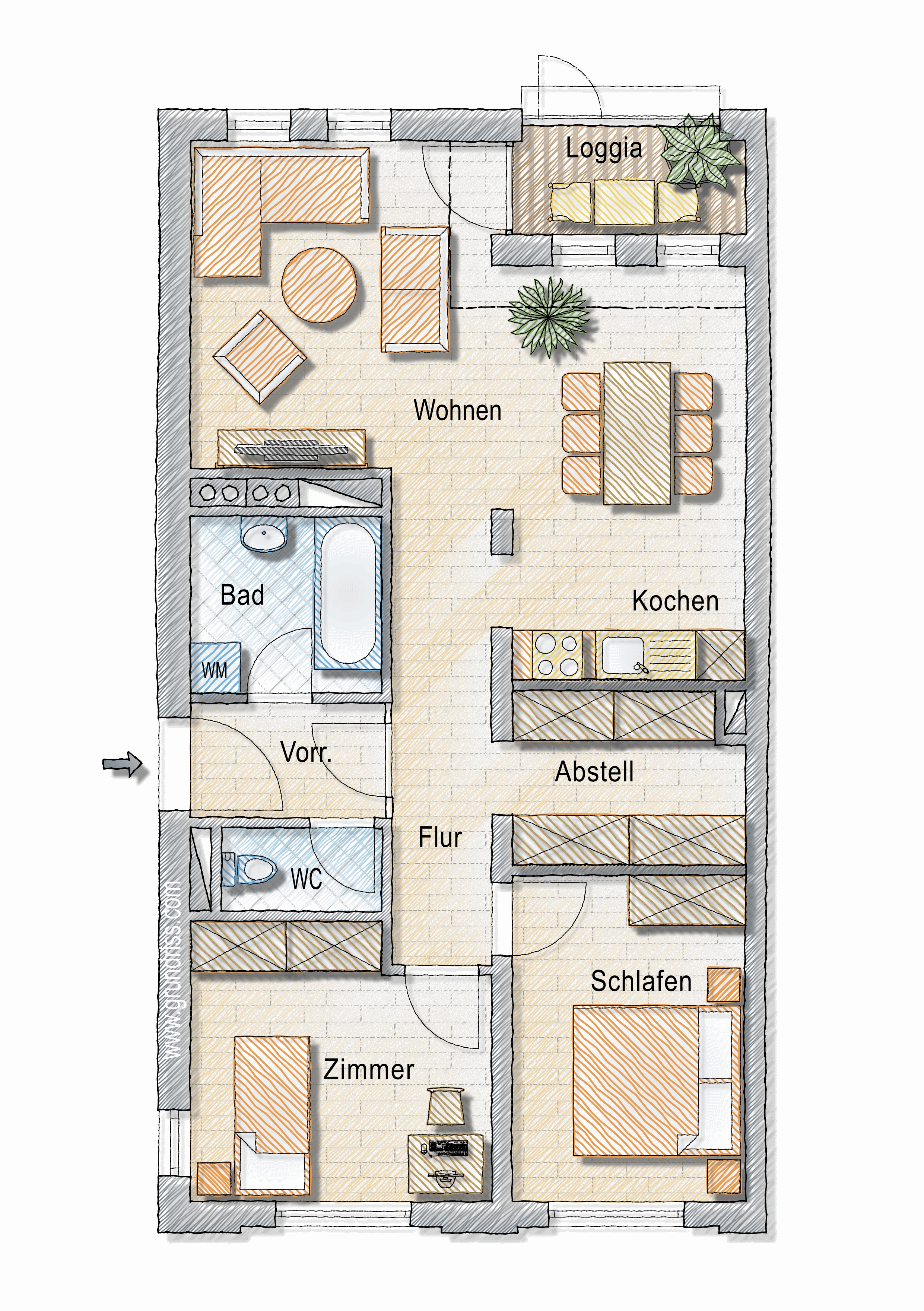 Abstellplatz, Abstellraum, Bad, Balkon, Flur, Kellerabteil, Kinderzimmer, Küche, Loggia, Schlafzimmer, Vorraum, WC, Wohn/EsszimmerStockwerk
