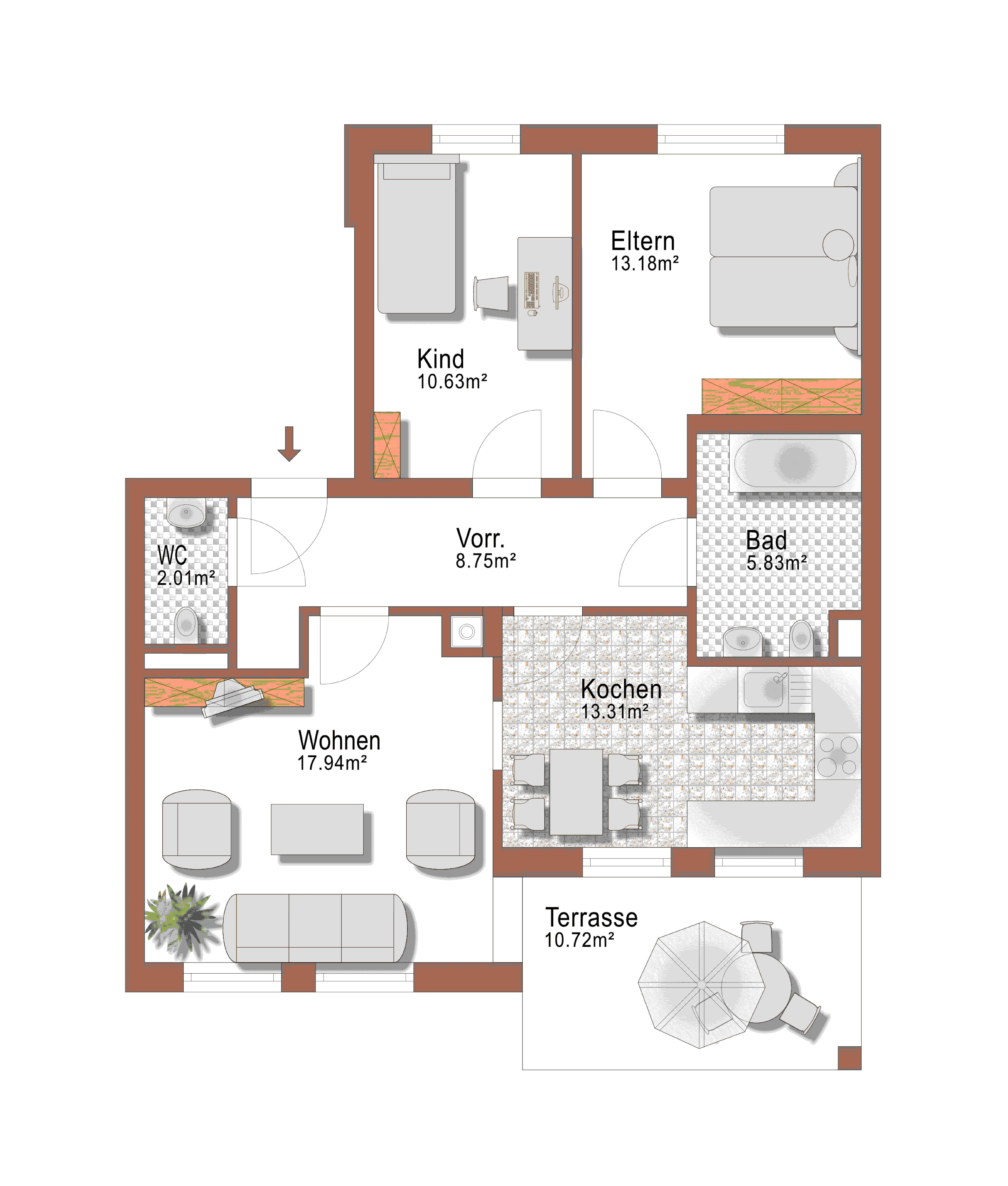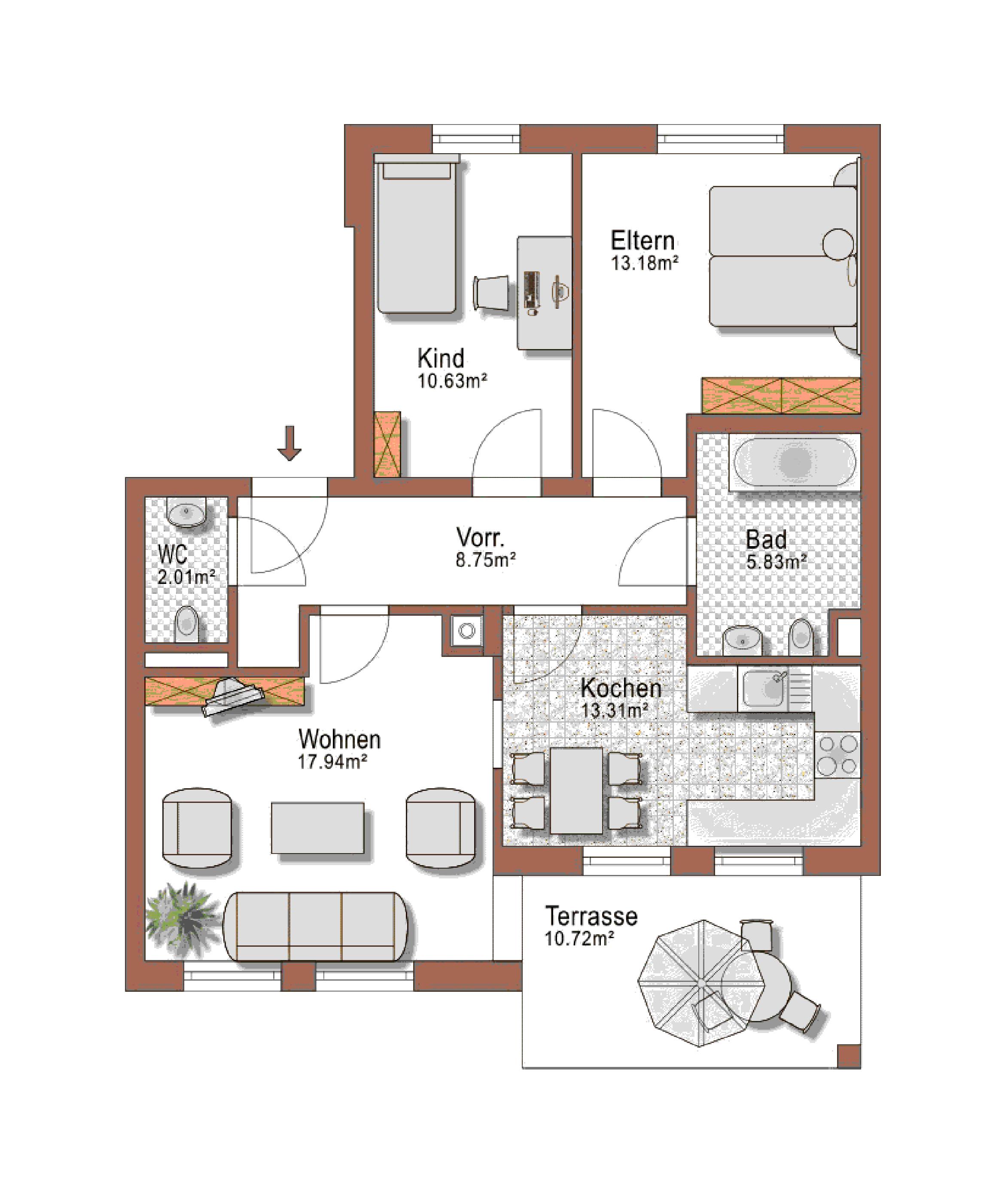 Abstellnische, Abstellplatz, Bad, Kellerabteil, Kinderzimmer, Kochen+Essen, Schlafzimmer, Terrasse, Vorraum, WC, WohnzimmerStockwerk