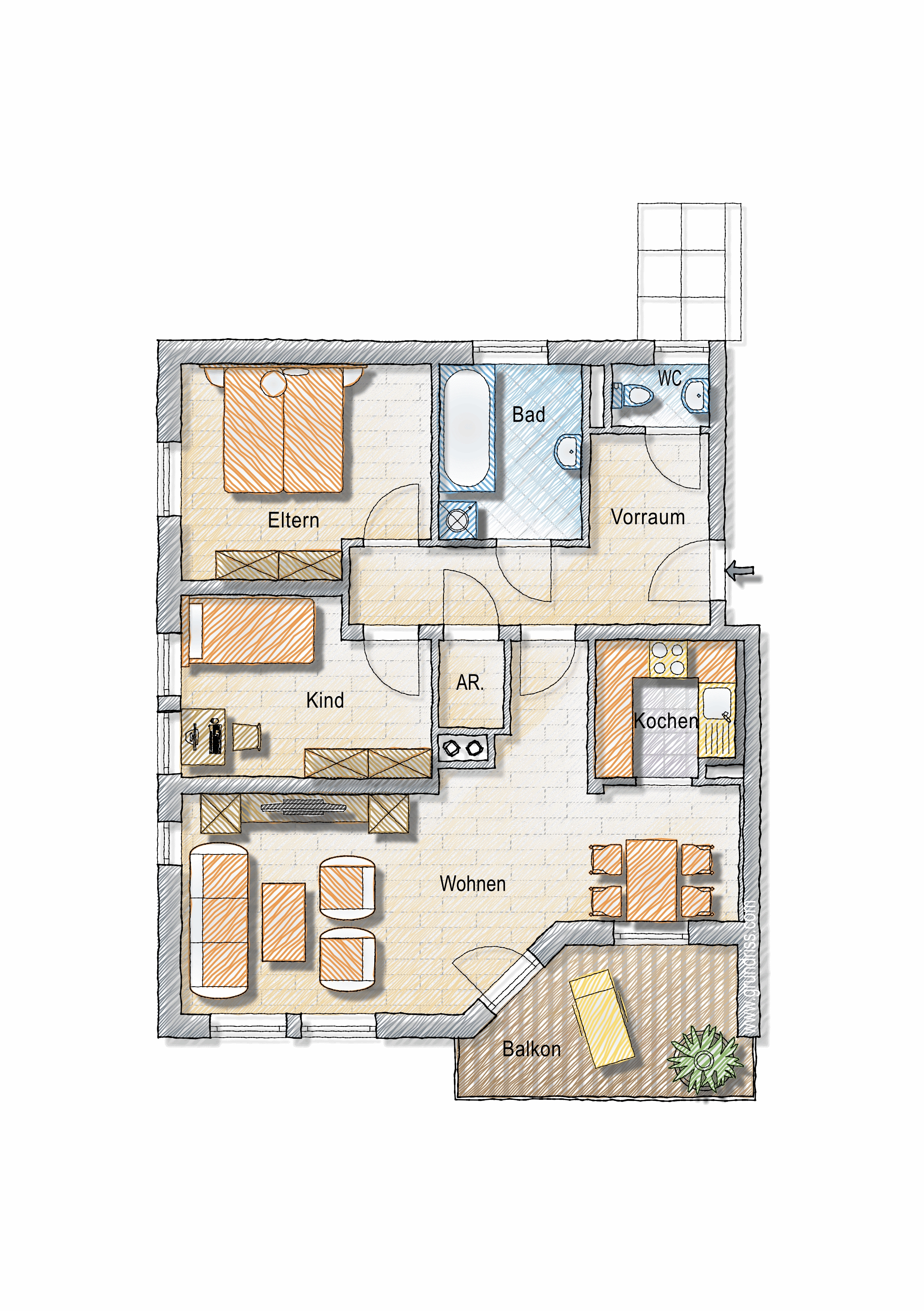 Abstellplatz, Abstellraum, Bad, Balkon, Kellerabteil, Kinderzimmer, Küche, Schlafzimmer, Vorraum, WC, Wohn/EsszimmerStockwerk