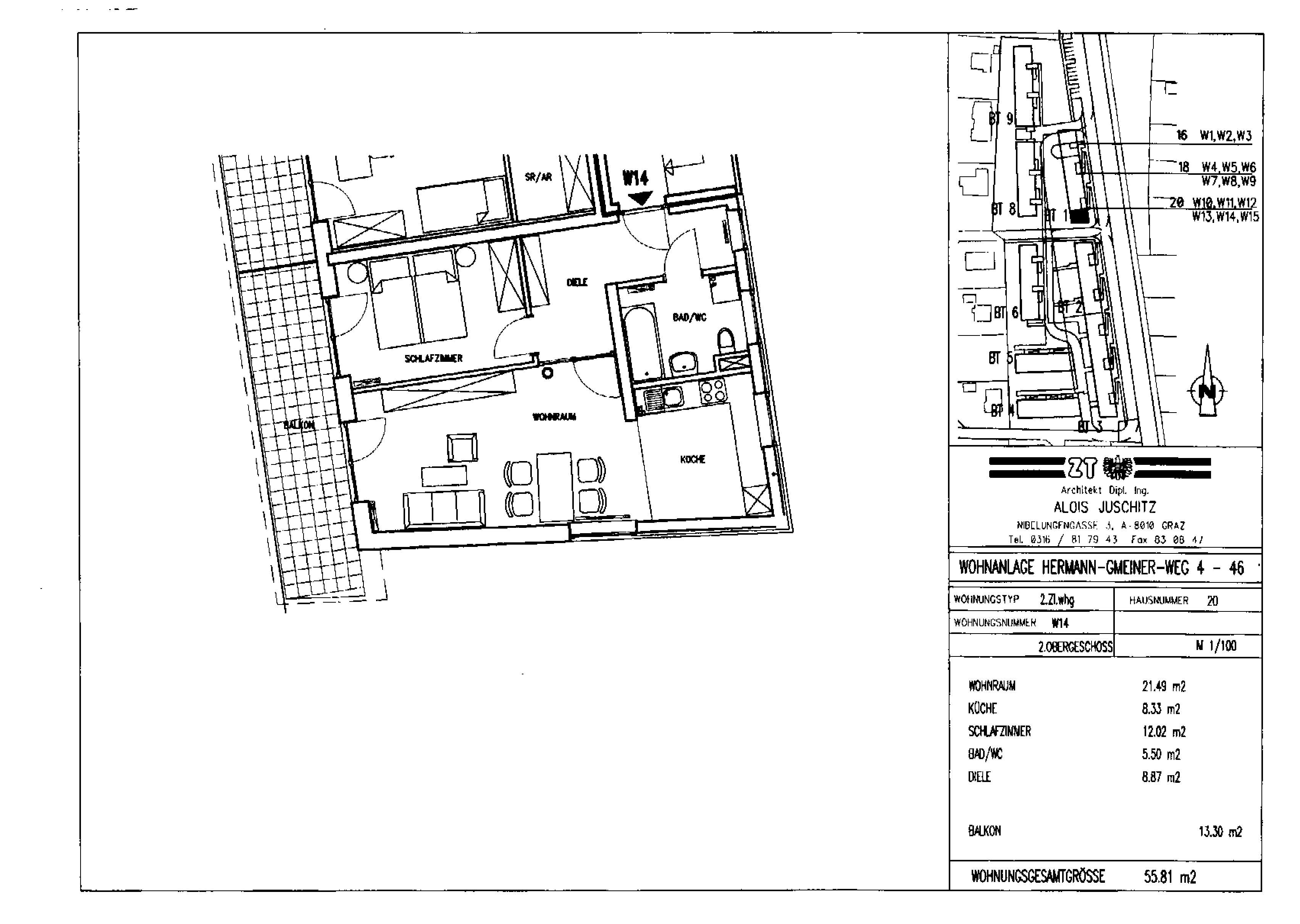 Bad/WC, Balkon, Diele, Küche, Schlafzimmer, Tiefgaragenabstellplatz, Wohn/EsszimmerStockwerk