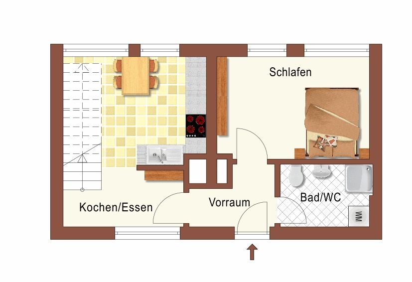 Im Erdgeschoss befindet sich der Vorraum, Kochen/Essen, Dusche/WC sowie das Schlafzimmer. Der Wohnbereich ist im Obergeschoss . Direkt vor der Wohnhausanlage befindet sich der Spar-Markt sowie die Haltestelle der Buslinie 41. Die Küche ist vom Mieter selbst zu möblieren.