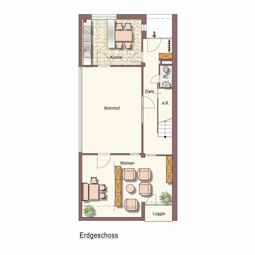 Abstellnische, AtriumWohnhof, Bad, Balkon, Diele, Gang, Kellerabteil, Kinderzimmer, Küche, Schlafzimmer, Terrasse, Tiefgaragenabstellplatz, WC, WohnzimmerStockwerk
