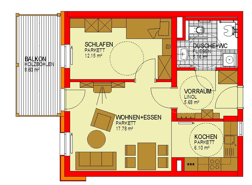 Balkon, Dusche/WC, Kellerabteil, Lift, Schlafzimmer, Vorraum, Wohnen/Essen/KücheStockwerk