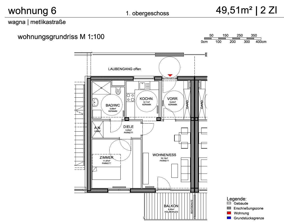 Abstellnische, Bad/WC, Balkon, Diele, Gedeckter Zugang, Kellerabteil, Kochnische, Lift, Schlafzimmer, Vorraum, Wohn/EsszimmerStockwerk