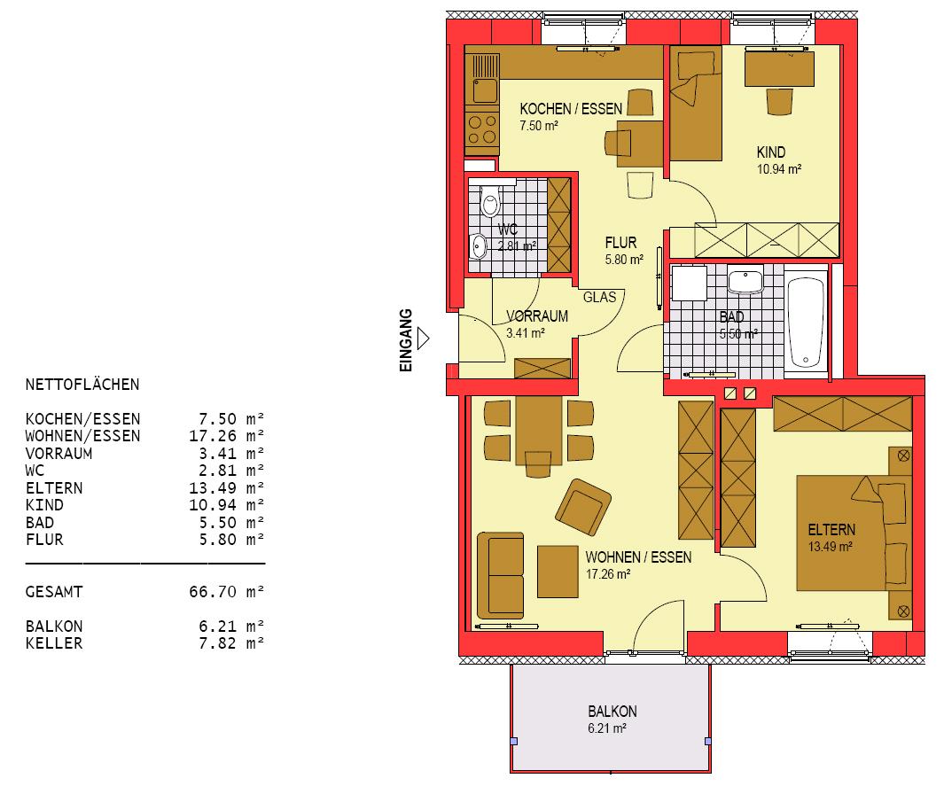 Bad, Balkon, Flur, Kellerabteil, Kinderzimmer, Küche, Schlafzimmer, Vorraum, WC, Wohn/EsszimmerStockwerk