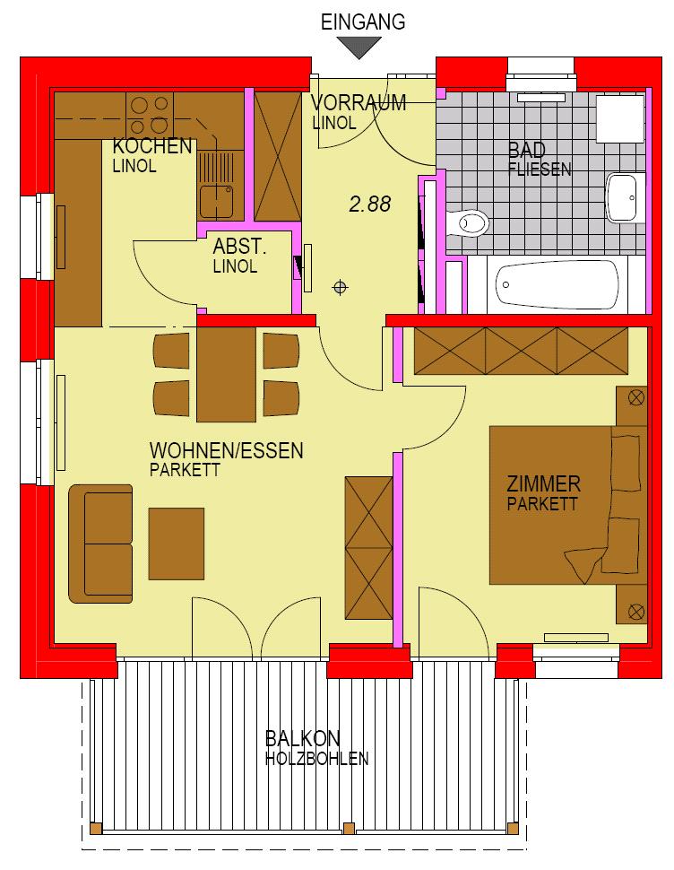 Die Wohnung befindet sich im 1. Obergeschoss und verfügt über einen sonnigen Balkon. Die Wohnung wird vom Land Steiermark in der Rechtsform "Miete mit Kaufoption" gefördert. Ein PKW-Abstellplatz im Carport (Miete € 28,62) ist zugeordnet.