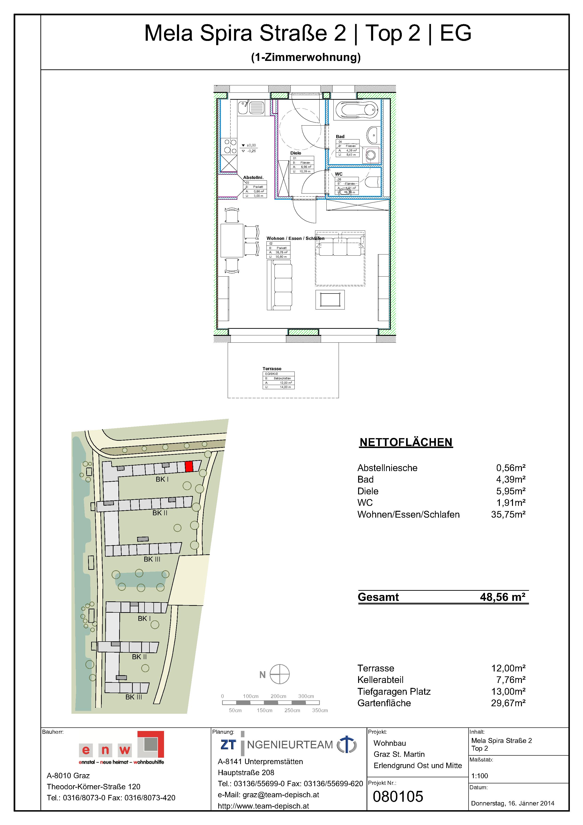 Abstellnische, Bad, Diele, Gartenanteil, Kellerabteil, Terrasse, Tiefgaragenabstellplatz, WC, Wohnen/Essen/KücheStockwerk