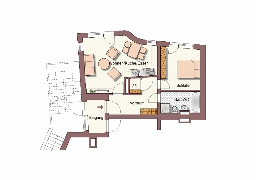 Abstellraum, Bad/WC, Kellerabteil, Kochen+Essen, Schlafzimmer, Tiefgaragenabstellplatz, Vorraum, WohnzimmerStockwerk