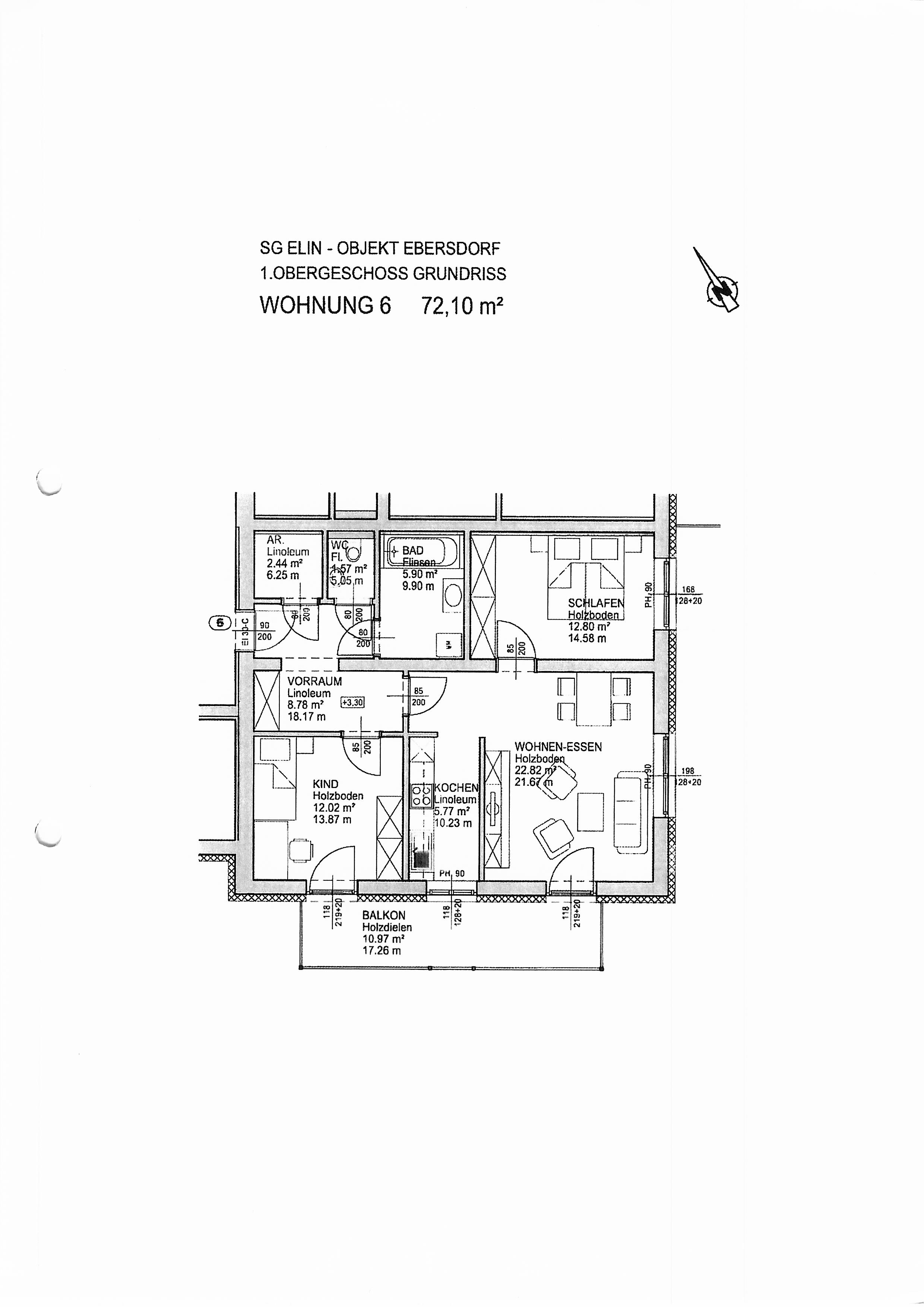 Abstellraum, Bad, Balkon, Kellerersatzabteil, Kinderzimmer, Schlafzimmer, Vorraum, WC, Wohnen/Essen/KücheStockwerk