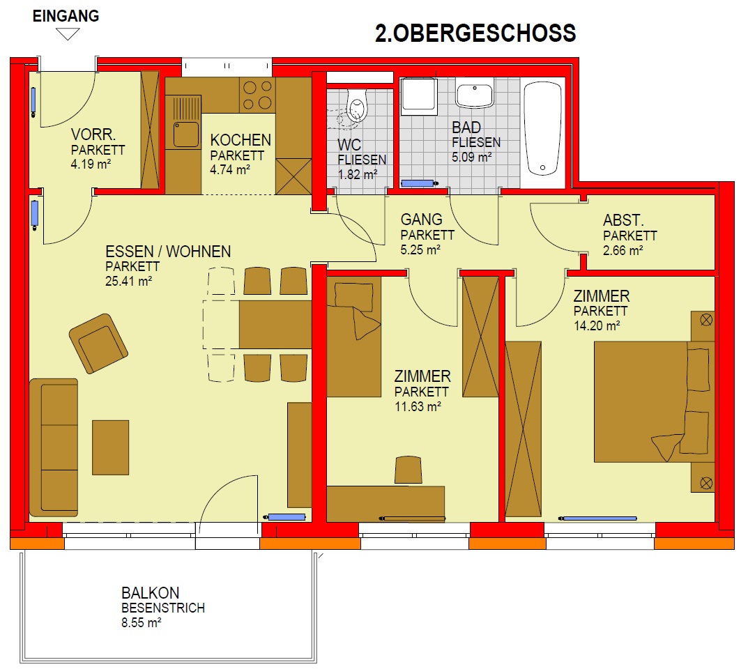 Abstellraum, Bad, Balkon, Gang, Kellerabteil, Kinderzimmer, Schlafzimmer, Tiefgaragenabstellplatz, Vorraum, WC, Wohnen/Essen/KücheStockwerk