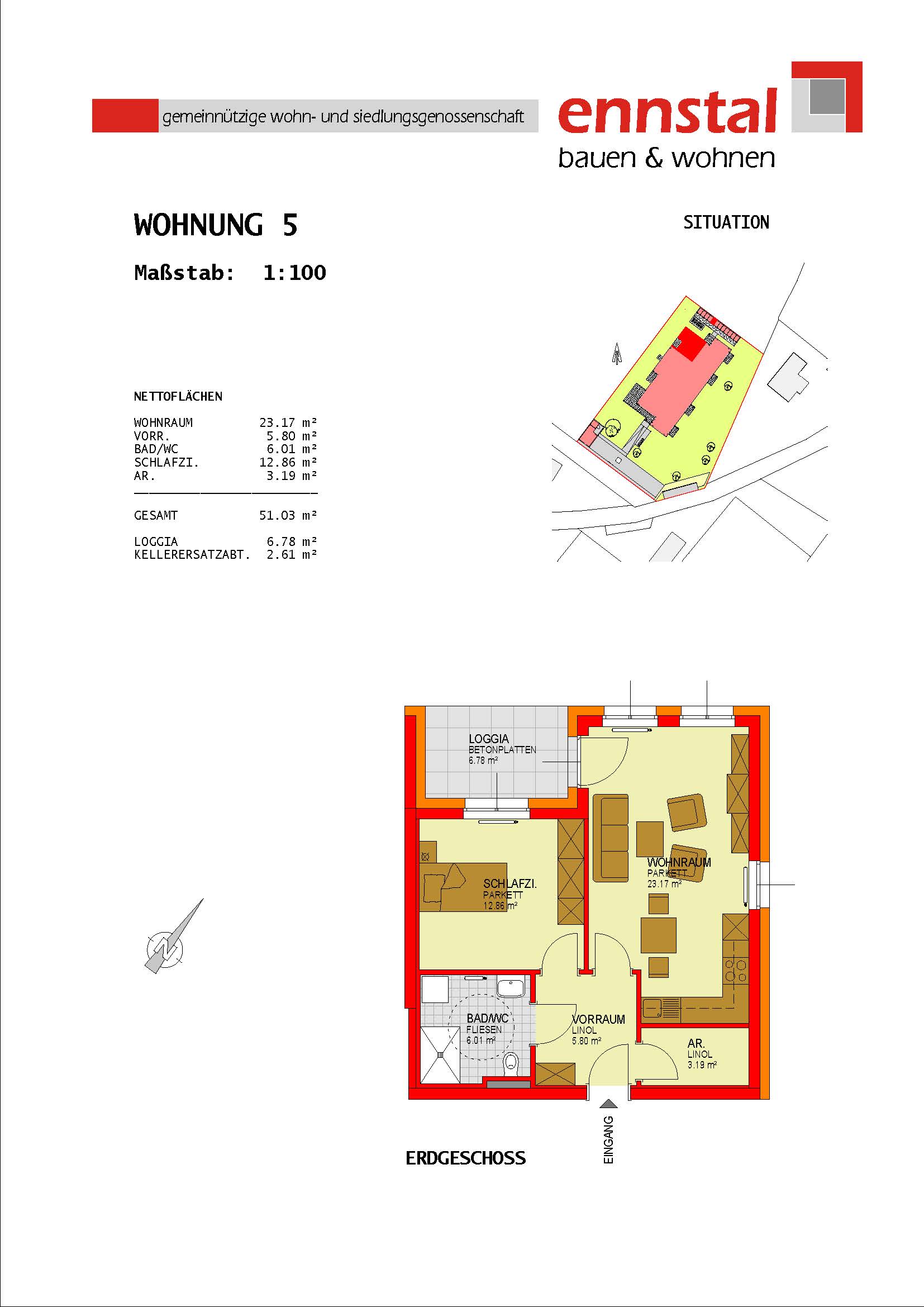 Abstellraum, Bad/WC, Kellerersatzabteil, Loggia, Schlafzimmer, Vorraum, Wohnen/Essen/KücheStockwerk