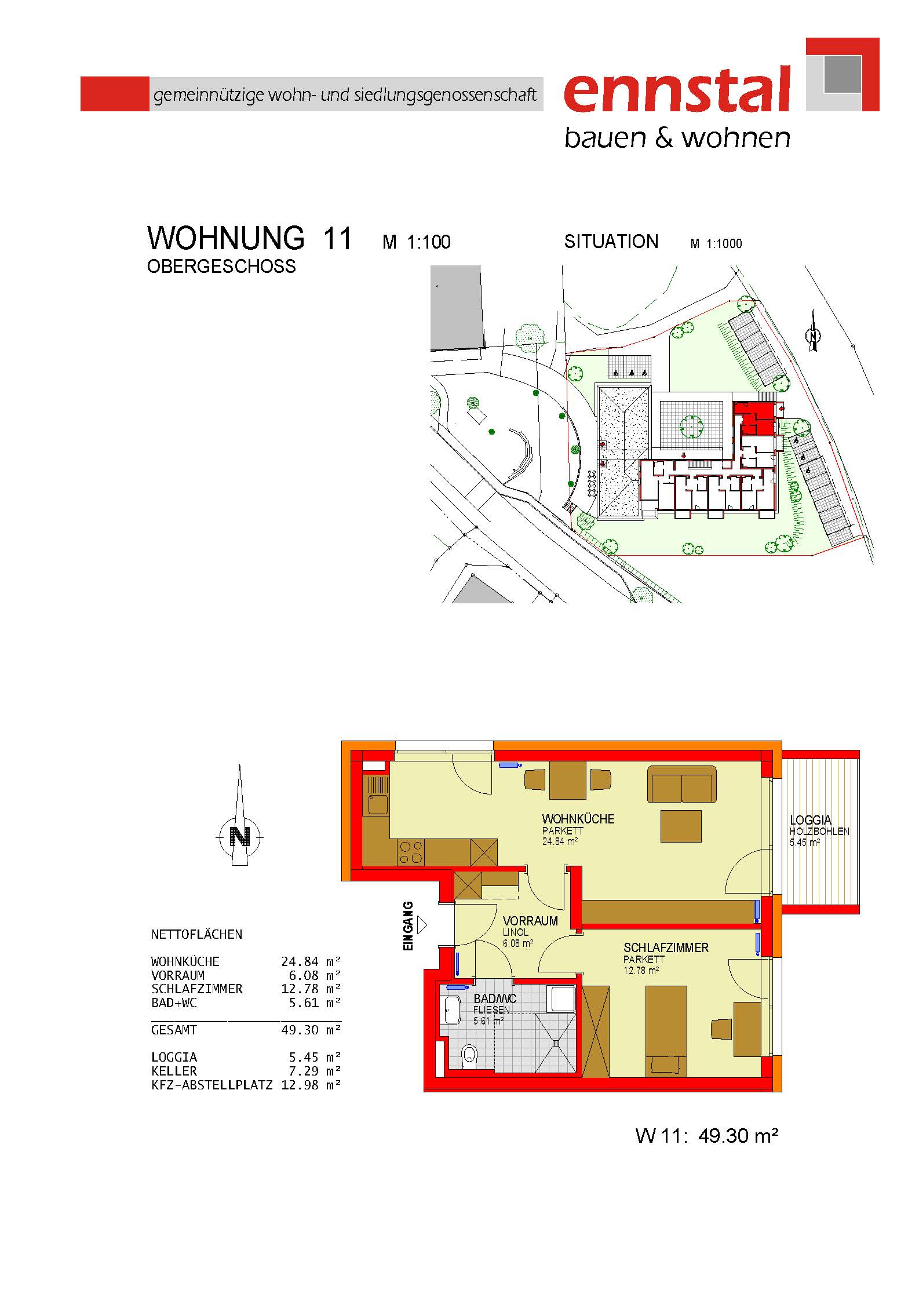 Bad/WC, Carport, Kellerabteil, Loggia, Schlafzimmer, Vorraum, Wohnen/Essen/KücheStockwerk