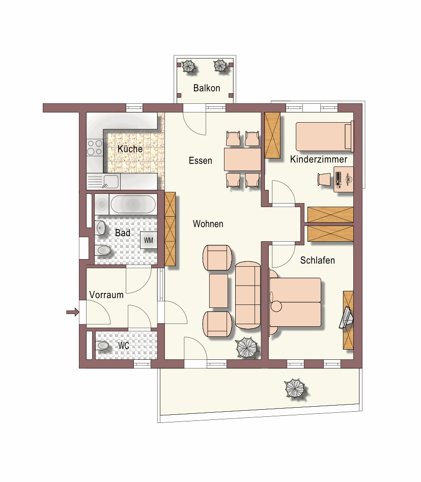 Bad, Balkon, Carport, Kellerabteil, Kinderzimmer, Schlafzimmer, Vorraum, Wohnen/Essen/Küche, WCStockwerk