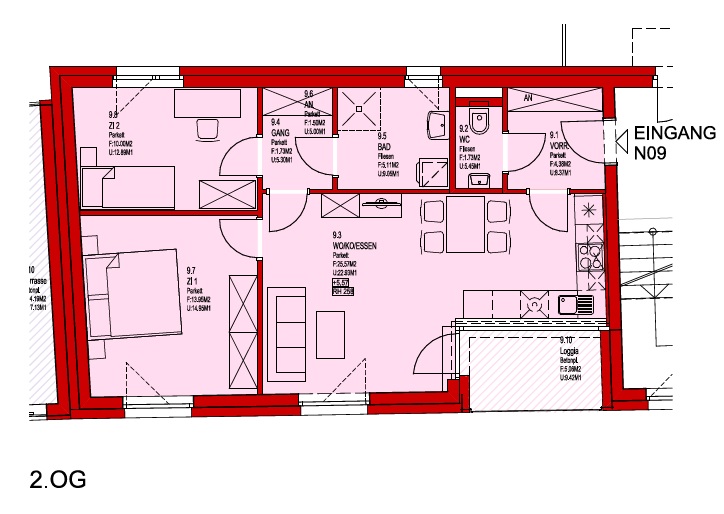 Bad, Gang, Kellerabteil, Kinderzimmer, Loggia, Schlafzimmer, Tiefgaragenabstellplatz, Vorraum, WC, Wohnen/Essen/KücheStockwerk