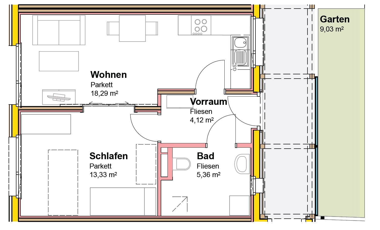 Bad/WC, Gartenanteil, Kellerabteil, Schlafzimmer, Terrasse, Vorraum, Wohnen/Essen/KücheStockwerk