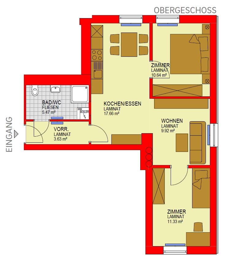 Bad/WC, Kellerersatzabteil, Kinderzimmer, Kochen+Essen, Schlafzimmer, Vorraum, WohnzimmerStockwerk