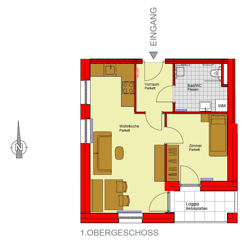 Bad/WC, Balkon, Kellerersatzabteil, Loggia, Schlafzimmer, Vorraum, WohnkücheStockwerk