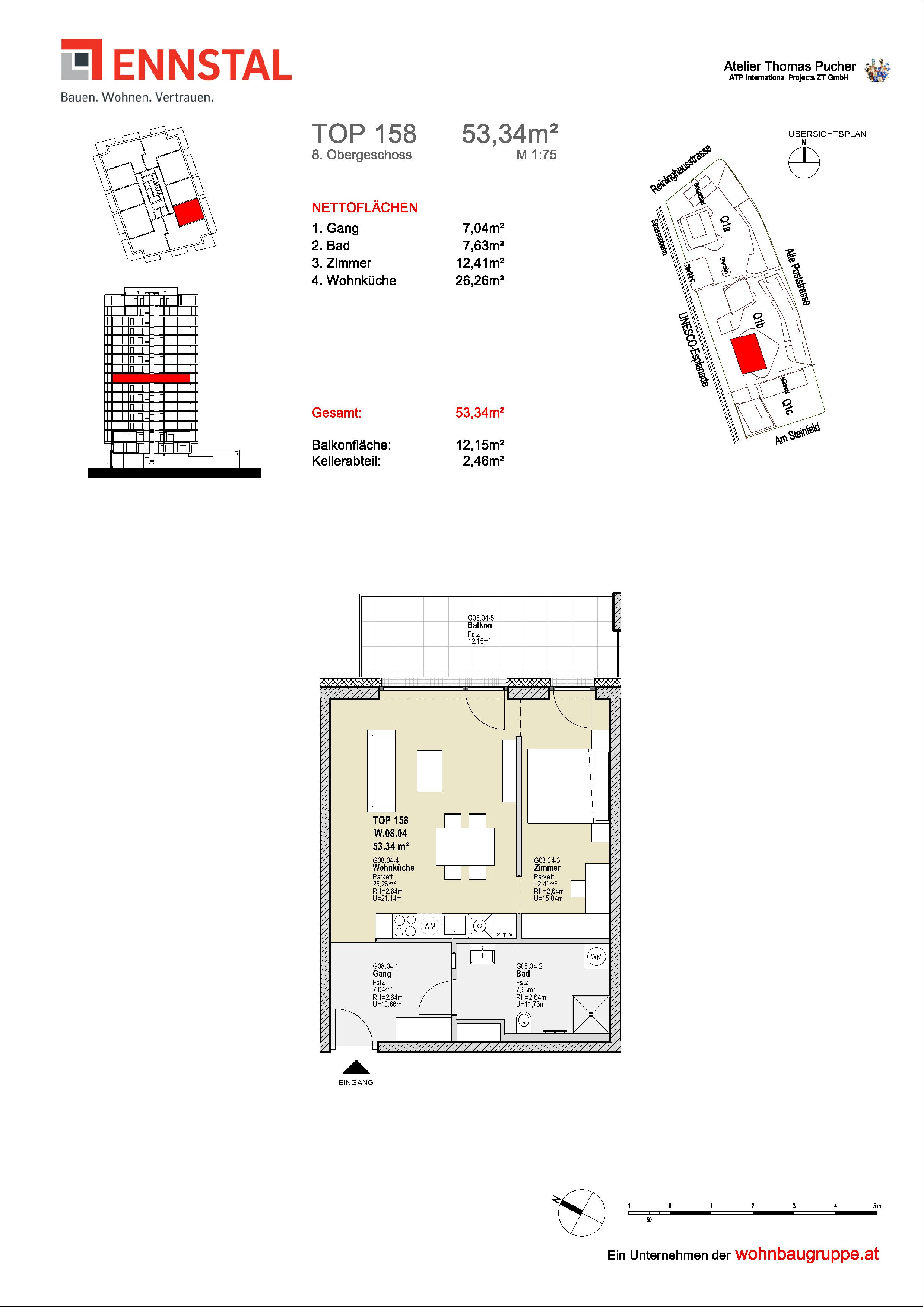 Balkon, Dusche/WC, Gang, Kellerabteil, Lift, Schlafzimmer, WohnkücheStockwerk