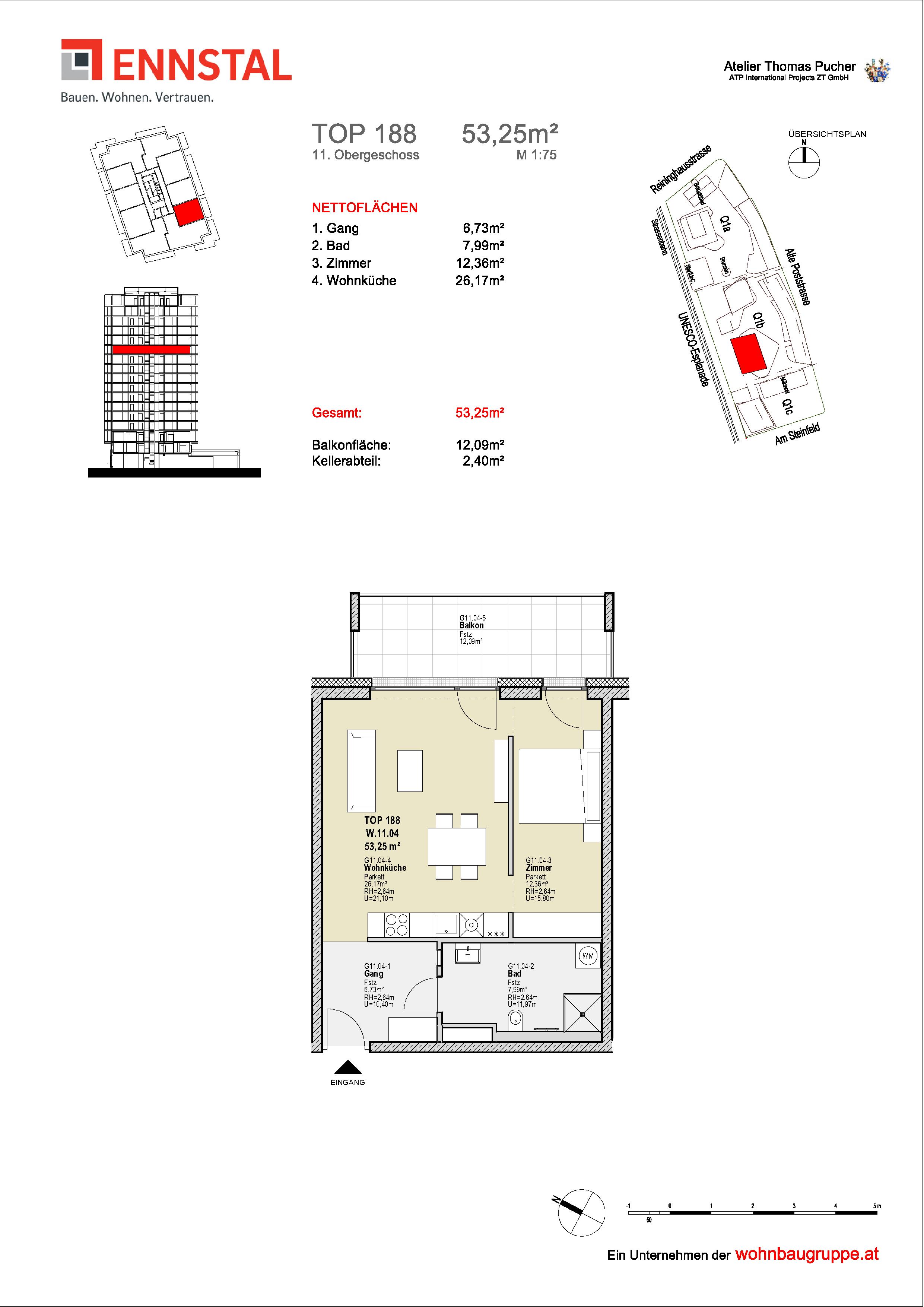 Balkon, Dusche/WC, Gang, Kellerabteil, Lift, Wohnen/Essen/Küche/SchlafenStockwerk