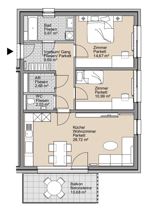 Abstellraum, Bad, Balkon, Gang, Kellerabteil, Kinderzimmer, Schlafzimmer, Tiefgaragenabstellplatz, Vorraum, WC, Wohnen/Essen/KücheStockwerk