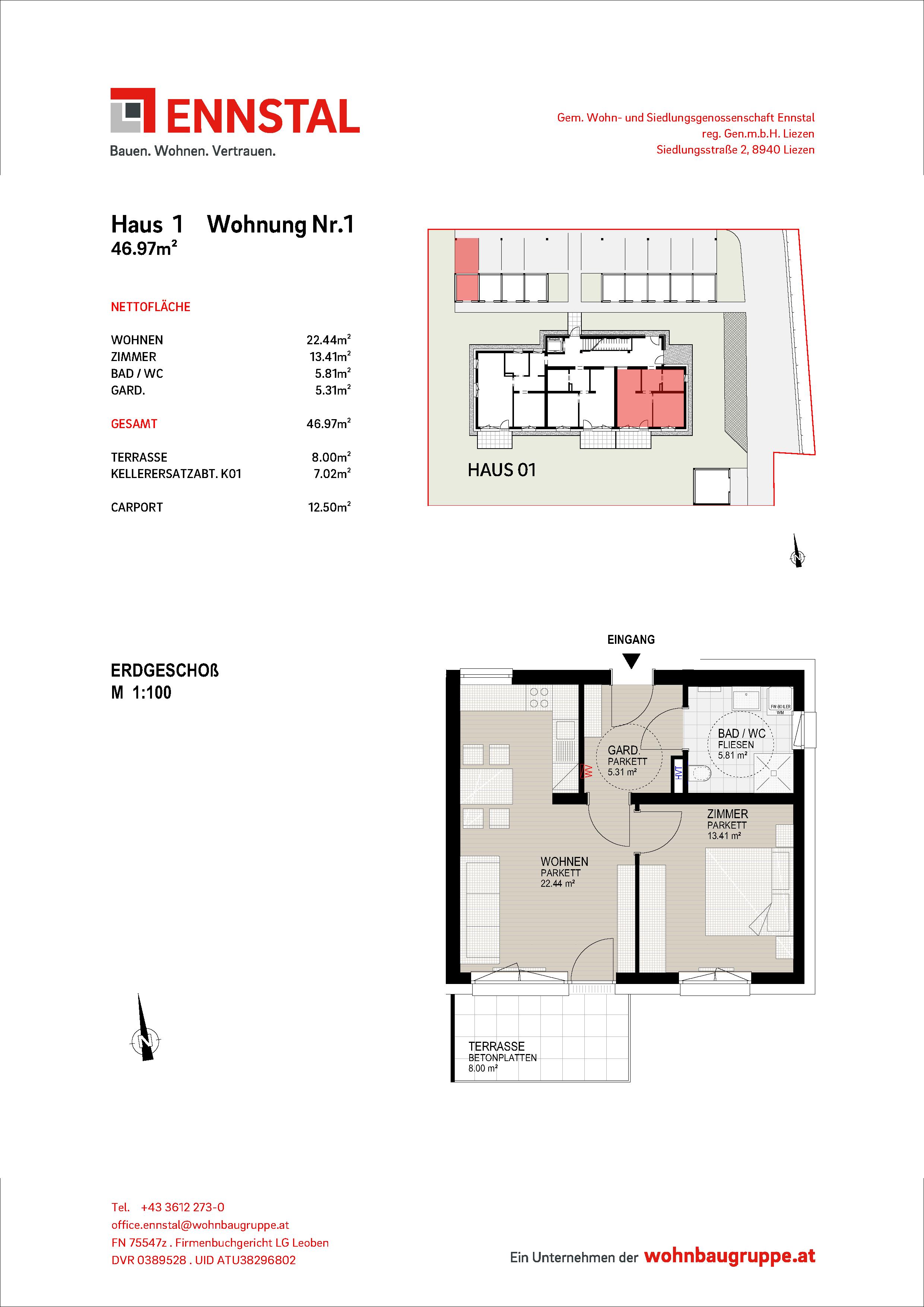 Bad/WC, Carport, Garderobe, Kellerabteil, Schlafzimmer, Terrasse, Wohnen/Essen/KücheStockwerk