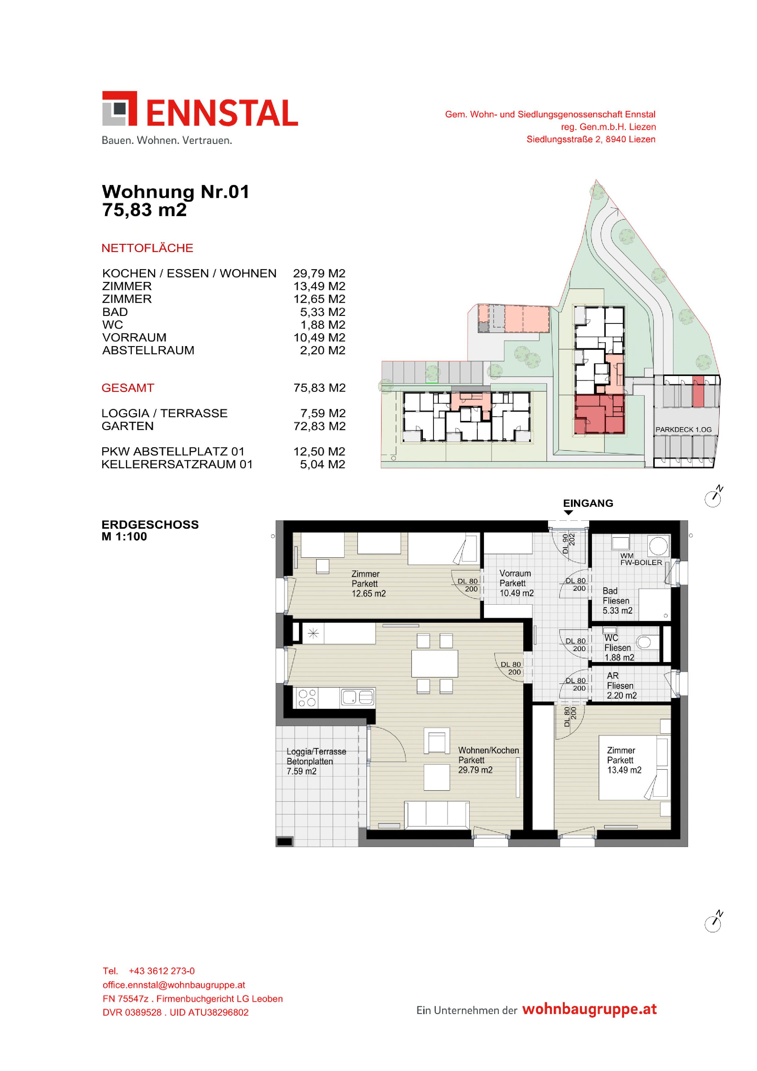Abstellraum, Bad, Gartenanteil, Kellerersatzabteil, Kinderzimmer, Loggia, offene Garage, Schlafzimmer, Terrasse, Vorraum, WC, Wohnen/Essen/KücheStockwerk