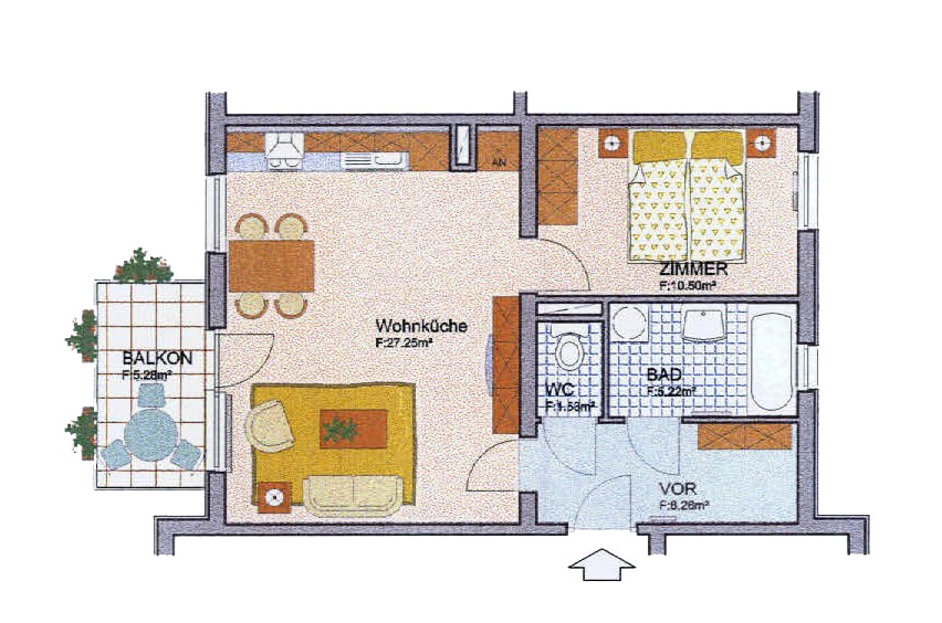 Bad, Balkon, Kellerabteil, Schlafzimmer, Tiefgaragenabstellplatz, Vorraum, WC, Wohnen/Essen/KücheStockwerk