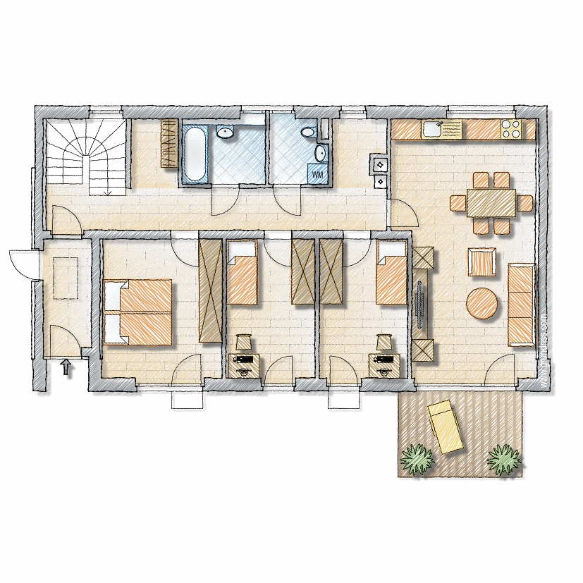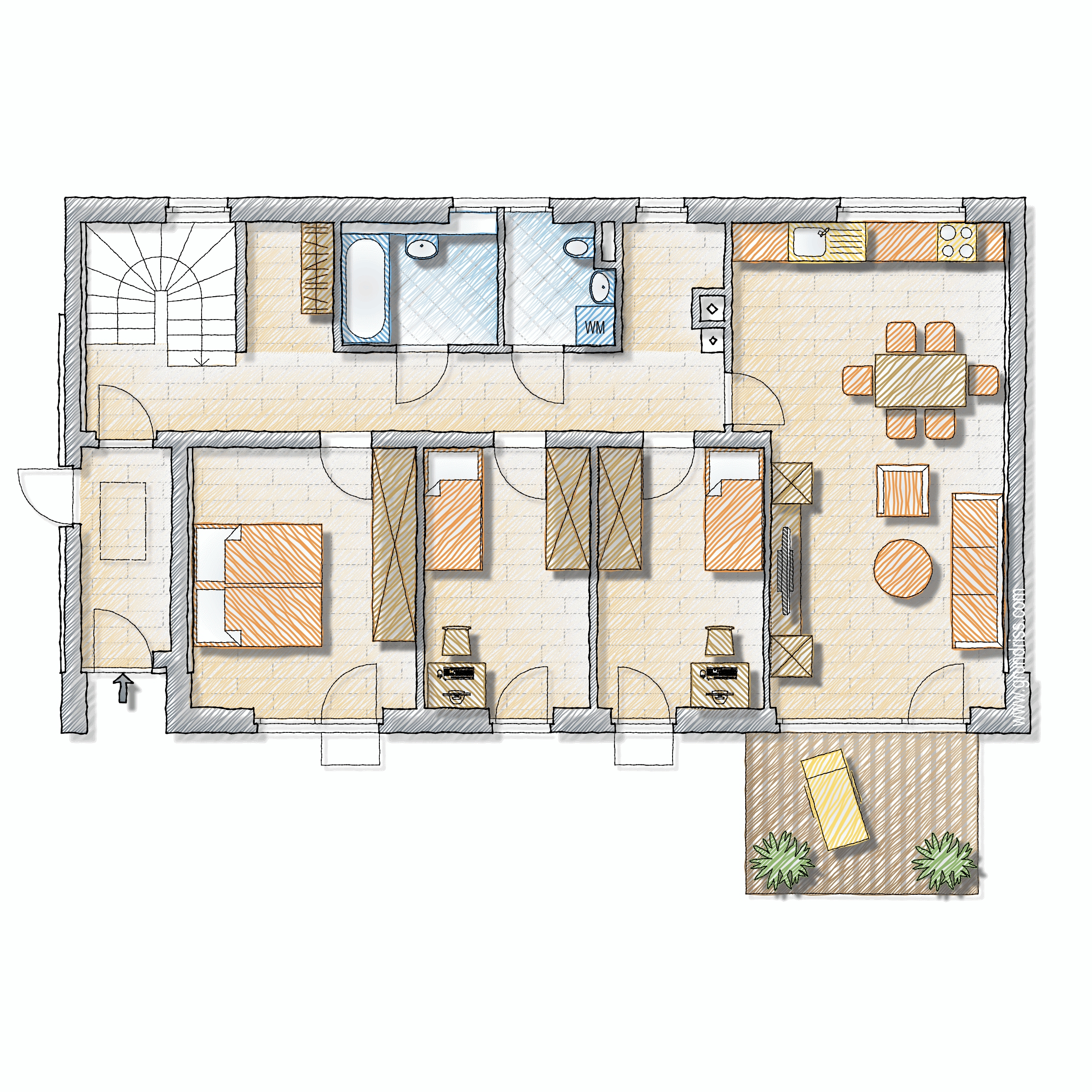 Kinderzimmer, Kinderzimmer, Abstellplatz, Abstellraum, Bad, Gartenanteil, Kellerabteil, Küche, Schlafzimmer, Terrasse, Vorraum, WC, WohnzimmerStockwerk